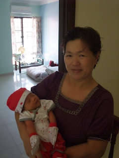 This is my Confinement Lady who was my guide and chaperone for 28 days after the birth of baby boy.....She was excellent - friendly, open, knowledgeable, flexible and genuinely loved Baby Boy Julian. The first pic shows her near the start of the Confinement Period and the second pic was taken on Baby's Full Moon Day (1 month old). The last shows our relationship and camaraderie - she's good....and available - so give me a holler if you'd like to contact her! :)